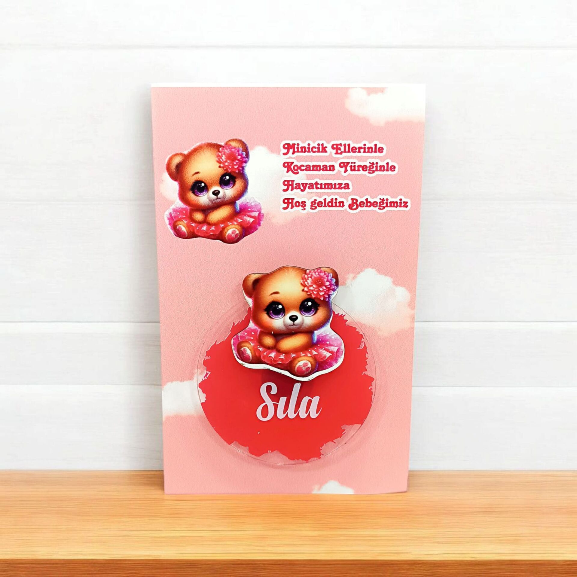 Çiçekli Ayıcık Figürlü Pleksi Magnet Kartlı | Sevimli ve Özel Bebek Magneti